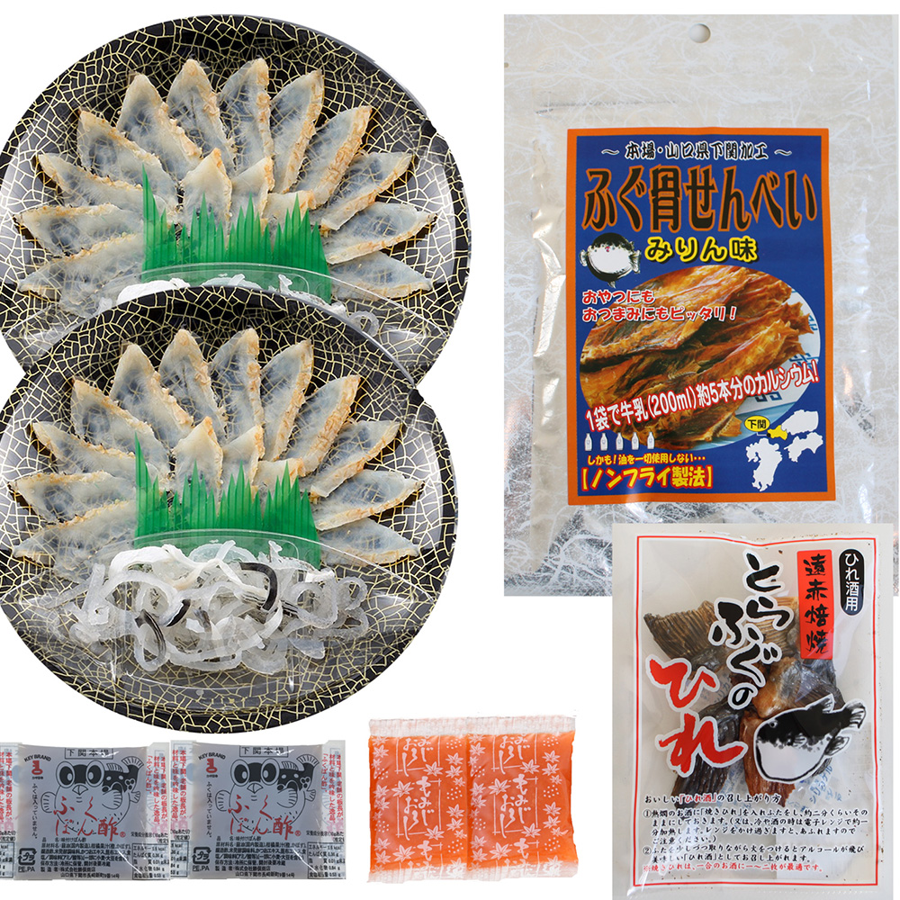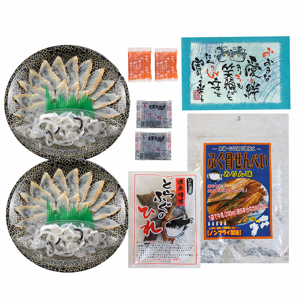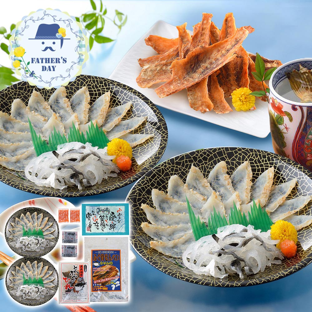 ■規格:真ふぐたたき刺身(17cm皿)20g×2、とらふぐ皮20g×2、ふぐ骨せんべい(みりん味)30g、ふくポン酢10g×2、もみじおろし10g×2、とらふぐ焼きヒレ5g ※父の日カード付