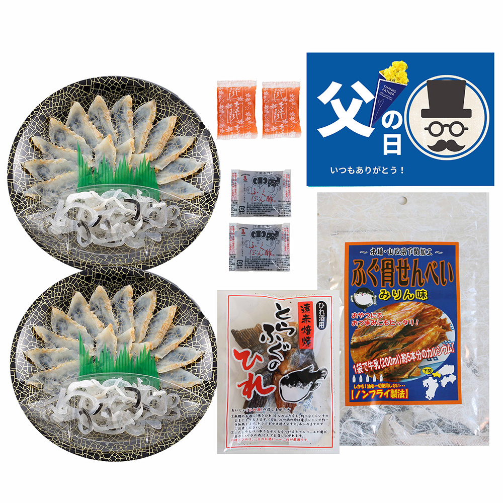 ■規格:真ふぐたたき刺身(17cm皿)20g×2、とらふぐ皮20g×2、ふぐ骨せんべい(みりん味)30g、ふくポン酢10g×2、もみじおろし10g×2、とらふぐ焼きヒレ5g ※父の日カード付