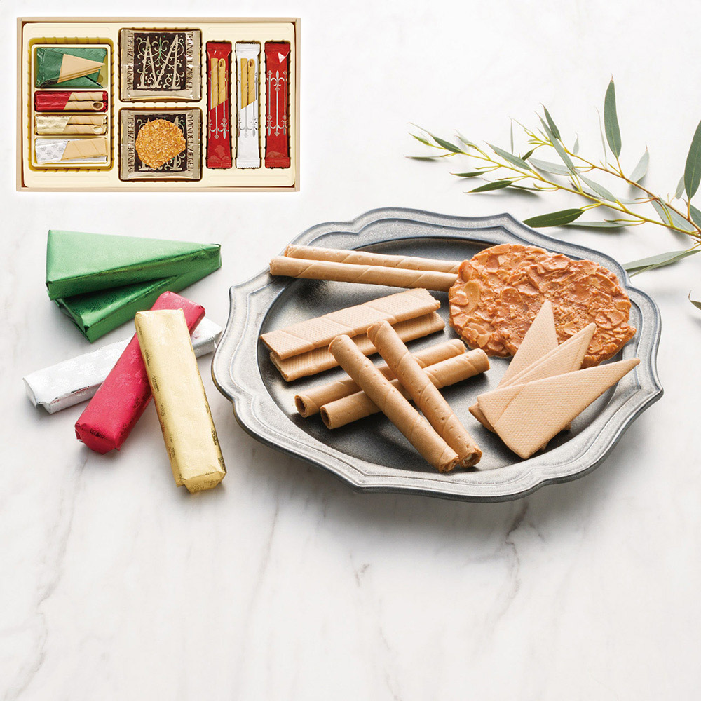 ■規格:エコルセ三角4包(12枚)・短冊6包(12枚)・丸型(ミルクチョコ・ホワイトチョコ)各4包(各8本)・マンデルチーゲル10枚・モンロワ(アーモンド6包(12本)・ヘーゼルナッツ3包(6本))