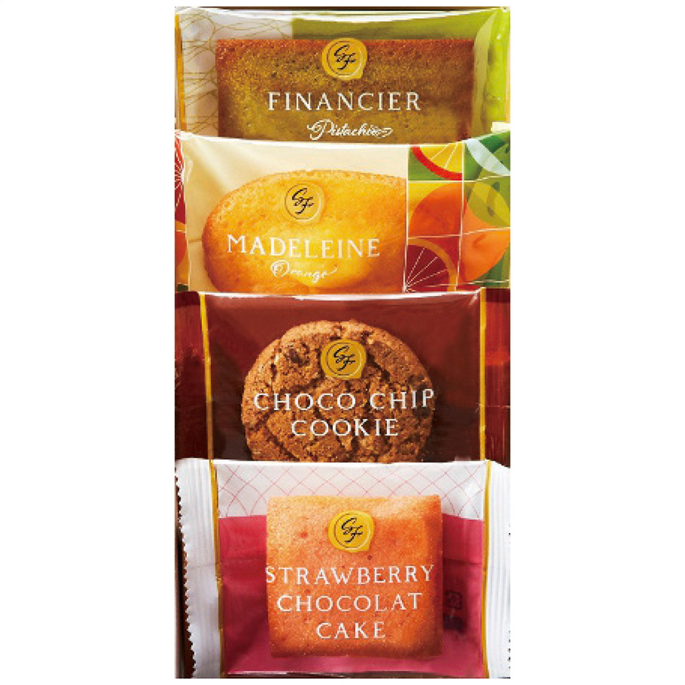 ■規格:オレンジマドレーヌ・ストロベリーショコラケーキ・ピスタチオフィナンシェ・チョコチップクッキー各1個