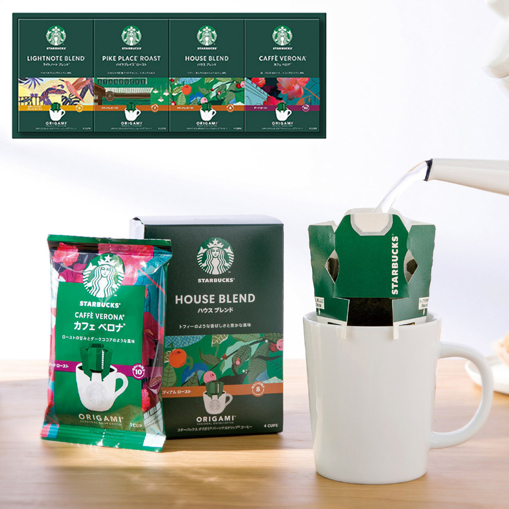 ■規格:スターバックスオリガミパーソナルドリップコーヒー(ハウスブレンド・パイクプレイスロースト・ライトノートブレンド・カフェベロナ各9g×4袋)各1箱