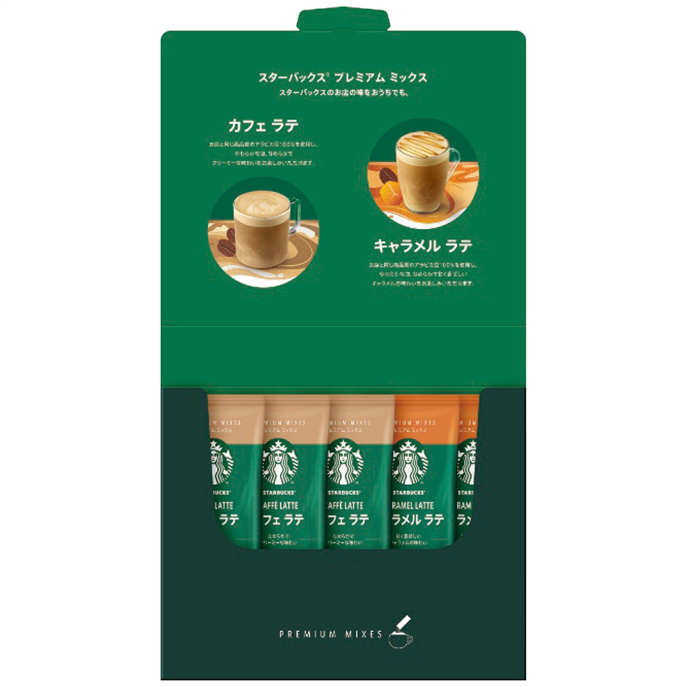 ■規格:スターバックスプレミアムミックス(カフェラテ18g×3袋・キャラメルラテ23g×2袋)