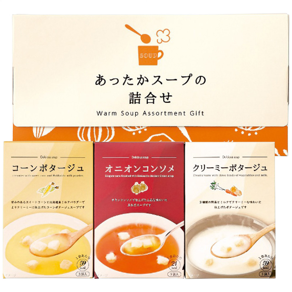 ■規格:コーンポタージュ(15g×3袋)・クリーミーポタージュ(15g×3袋)・オニオンコンソメ(7g×3袋)各1個
