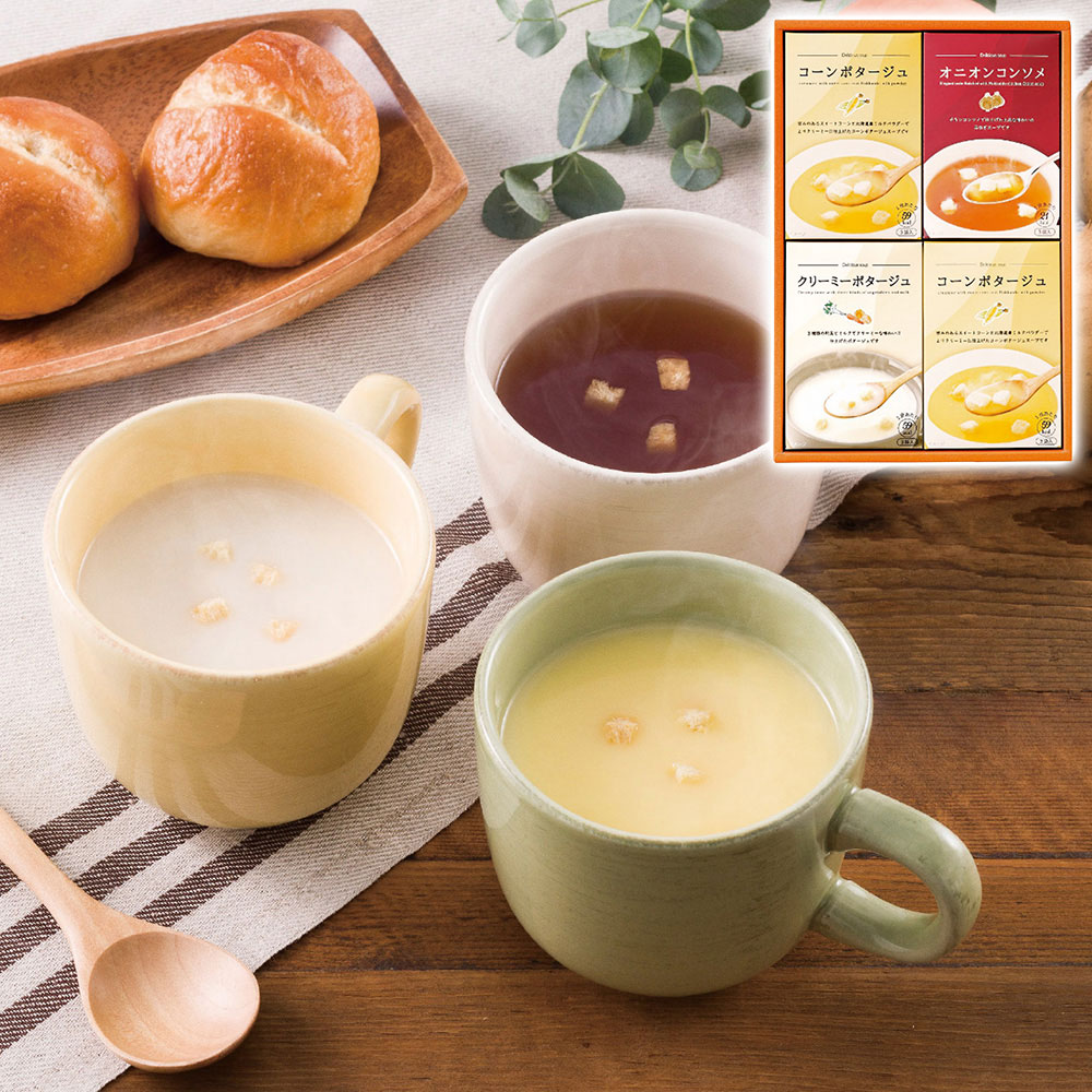 ■規格:コーンポタージュ(15g×3袋)2個・クリーミーポタージュ(15g×3袋)・オニオンコンソメ(7g×3袋)各1個