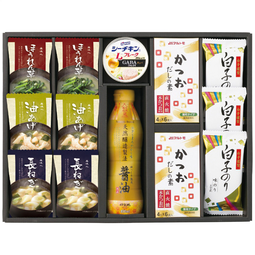 ■規格:フリーズドライ味噌汁(油あげ7.2g・ほうれん草6.2g・長ねぎ6.3g)・マルトモかつおだしの素(4g×6個)各2個・伊賀越天然醸造醤油450ml×1本・白子のり味のり(8切5枚)3個・シーチキンLフレークGABA入り70g×1缶