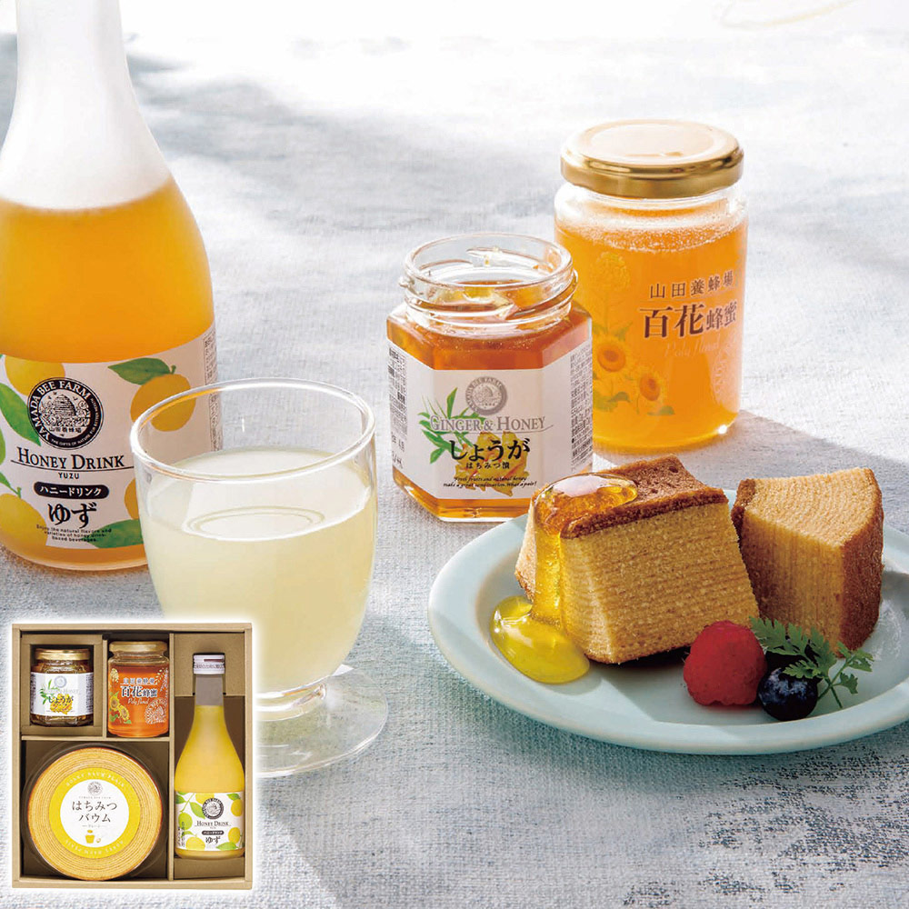 ■規格:はちみつバウム1個・ゆずハニードリンク(約6倍希釈)300ml・百花蜂蜜(ルーマニア産)200g・しょうがはちみつ漬120g各1瓶