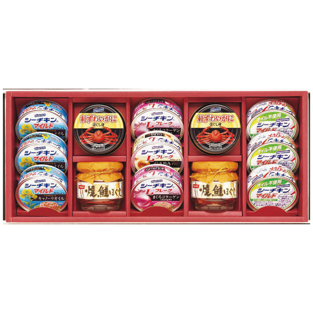 ■規格:シーチキンマイルドキャノーラ・オイル不使用シーチキンマイルド各3缶・シーチキンLフレークコラーゲン入り2缶・シーチキンLフレークGABA入り1缶・各70g・紅ずわいがにほぐし身55g×2缶・焼鮭ほぐし50g×2瓶
