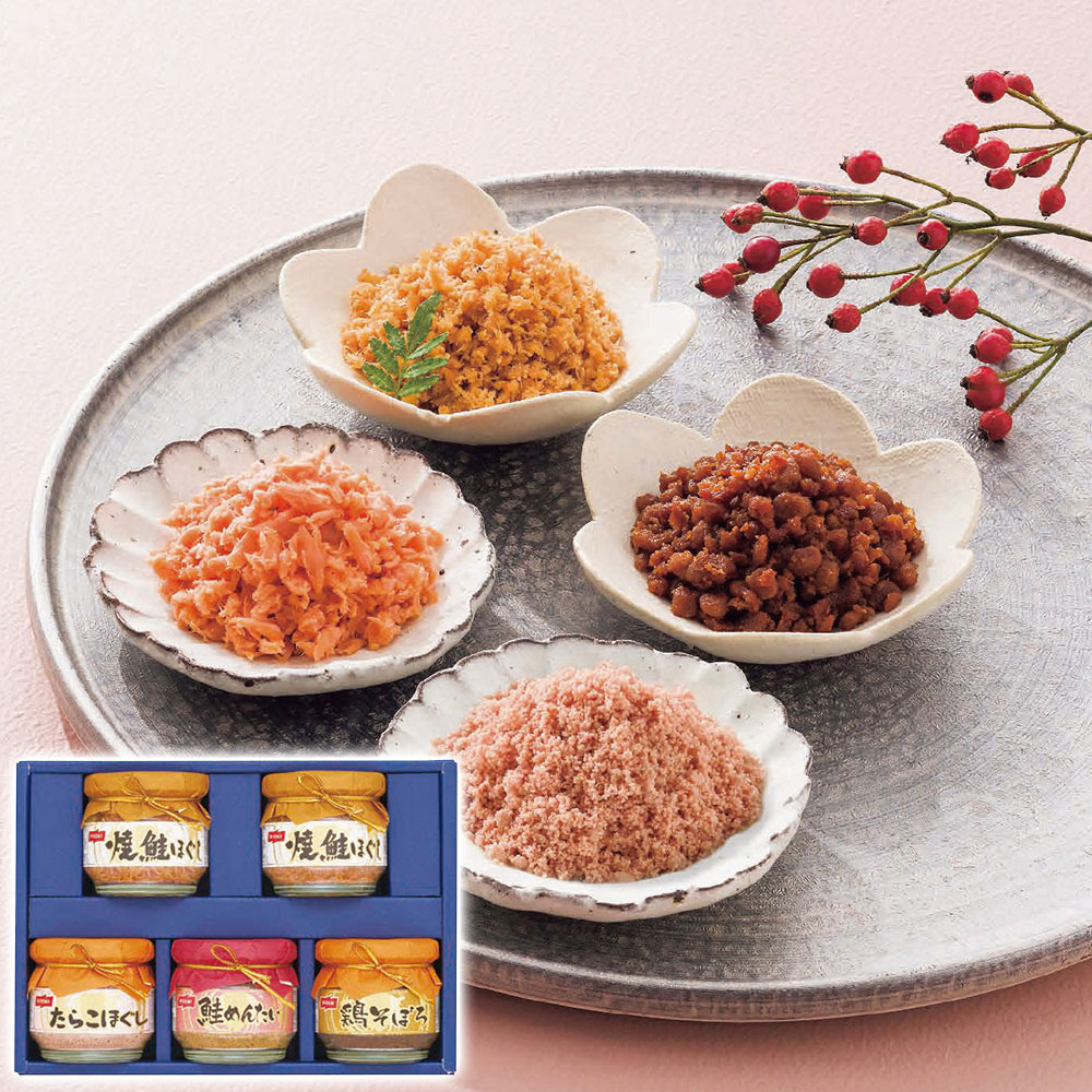 ■規格:焼鮭ほぐし2瓶・たらこほぐし・鮭めんたい・鶏そぼろ各1瓶・各50g