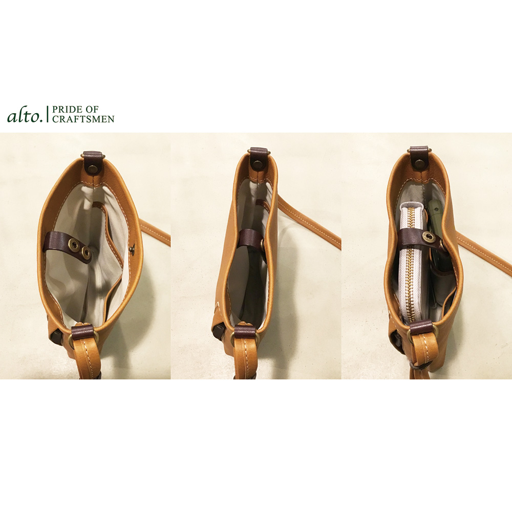 底を織り込むといった特殊な手法・構造により、他には無い新鮮なシルエットを実現。口元をシームレスにすることで、より洗練された上品な仕上がりに。コンパクトでありながら長財布も入ります。ホックは2段階に調節ができ、厚みのある財布も収納可能です。大人のちょい持ちバッグとしておすすめです。