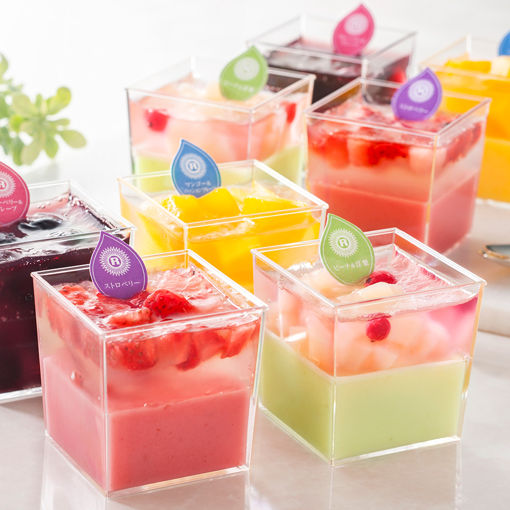 みずみずしいフルーツを果汁感のあるプリンやゼリーにとじこめました。