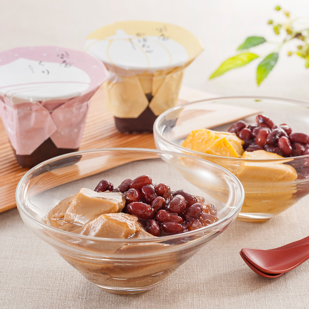 甘く炊いた小豆を寒天で固め、 その上に滑らかなプリンを重ねました。