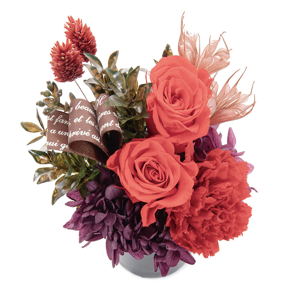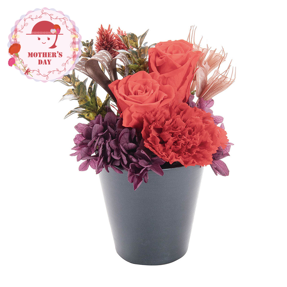 プリザーブドフラワーは生花特有の美しさをそのままに保存加工した長く楽しめるお花。ローズとアジサイ、カーネーションの美しいグラデーションのデザイナーズアレンジで、お母様に笑顔を一緒にプレゼント!※入荷状況により花材が若干変更となる場合がございます。ひとつづつ丁寧に手作りさせていただきますので、若干の個体差が生じる場合がございます。