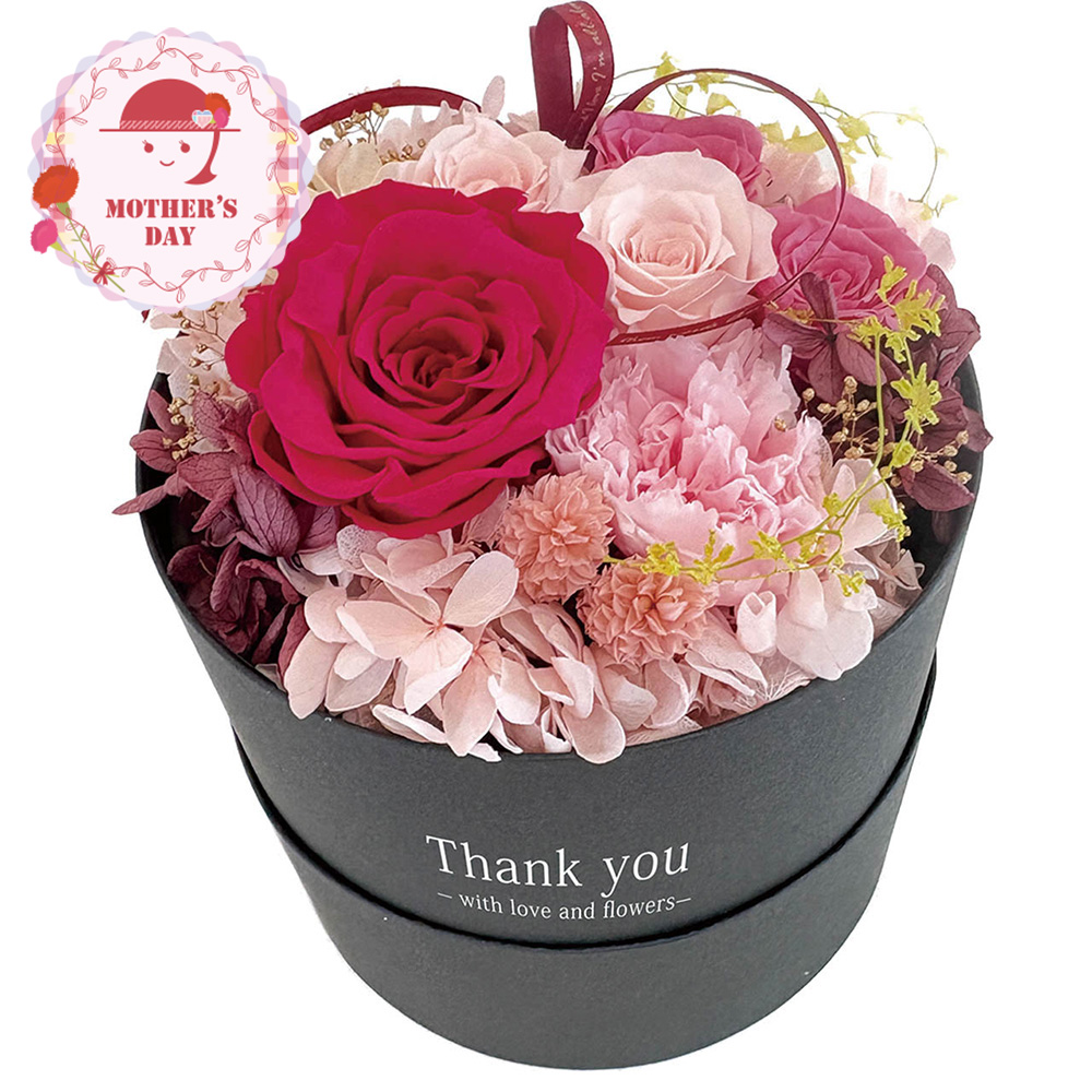 プリザーブドフラワーは生花特有の美しさをそのままに保存加工した長く楽しめるお花。ローズとアジサイ、カーネーションの美しいグラデーションのデザイナーズアレンジで、お母様に笑顔を一緒にプレゼント!※入荷状況により花材が若干変更となる場合がございます。ひとつづつ丁寧に手作りさせていただきますので、若干の個体差が生じる場合がございます。