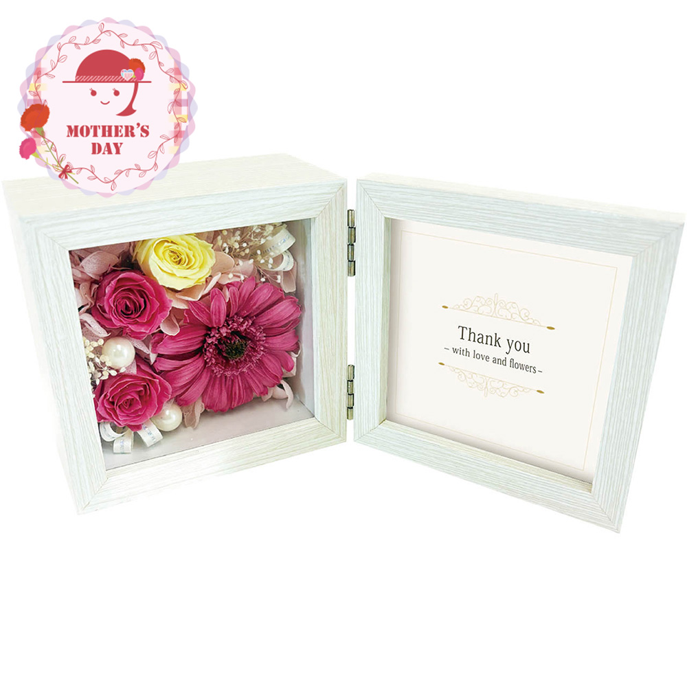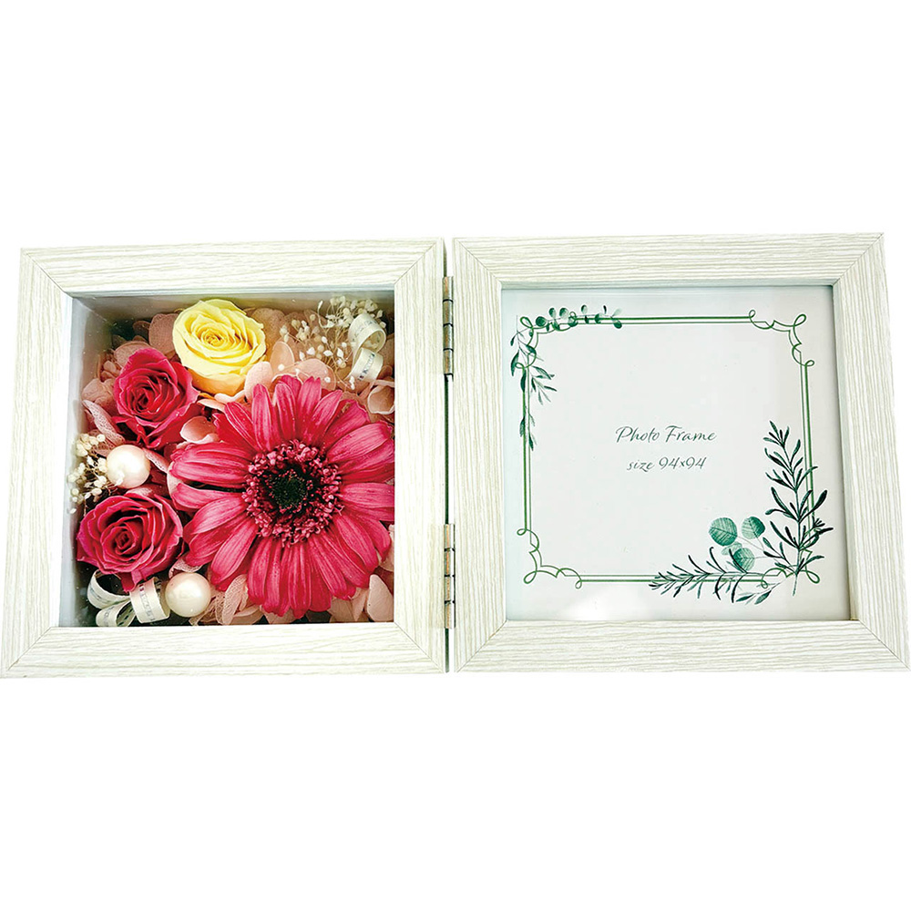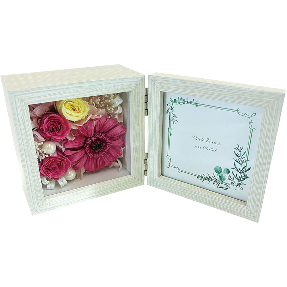 プリザーブドフラワーのボックスアレンジと、写真やカードをセットして飾れます。色褪せない思い出とお花、あなただけの特別なギフト