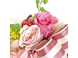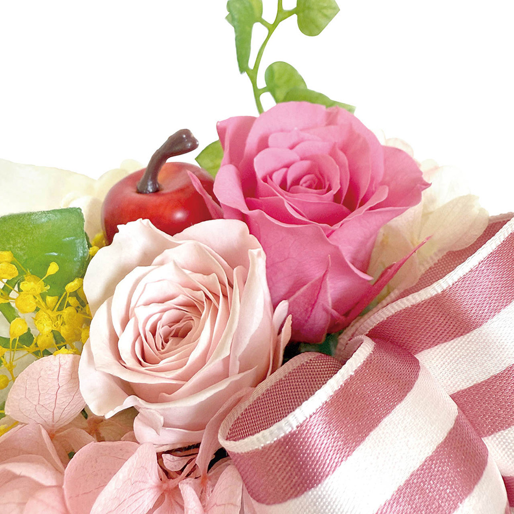 バスケットにはお花とプリサイズのアップル。軽やかで華やかなアレンジメントです。