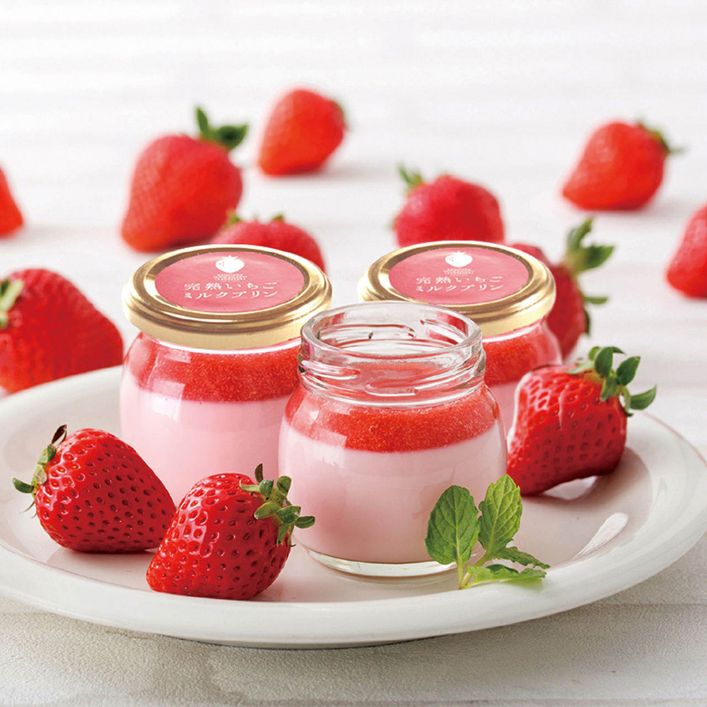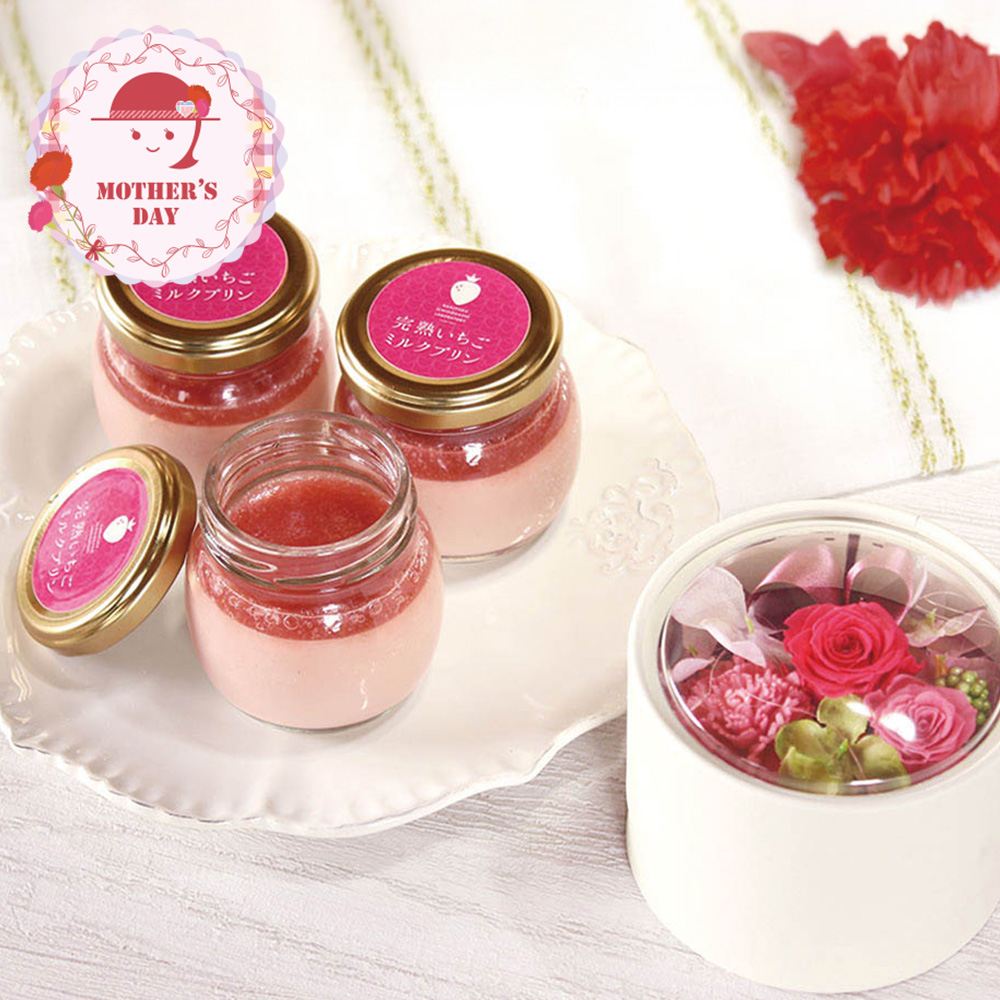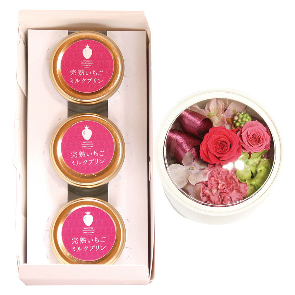 プリンとソース、ダブルのいちごで美味しさにこだわった「完熟いちごミルクプリン」と美しいプリザーブドフラワーのセットです。