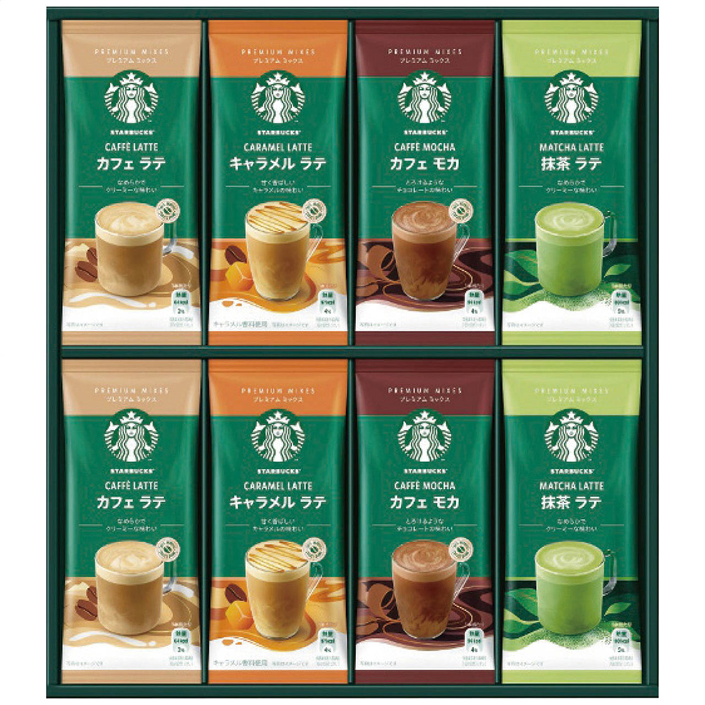 ■規格:スターバックスプレミアムミックス(カフェラテ18g、キャラメルラテ23g、抹茶ラテ24g、カフェモカ22g各4袋)