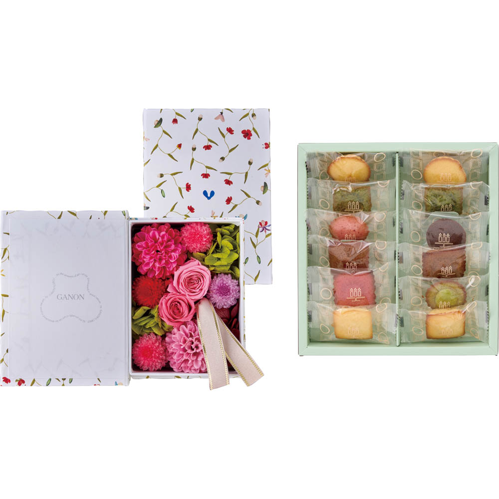 「GANON」が監修したプリザーブドフラワーと「アンリ・シャルパンティエ」のプティ・ガトー・アソルティをセットでお届け。