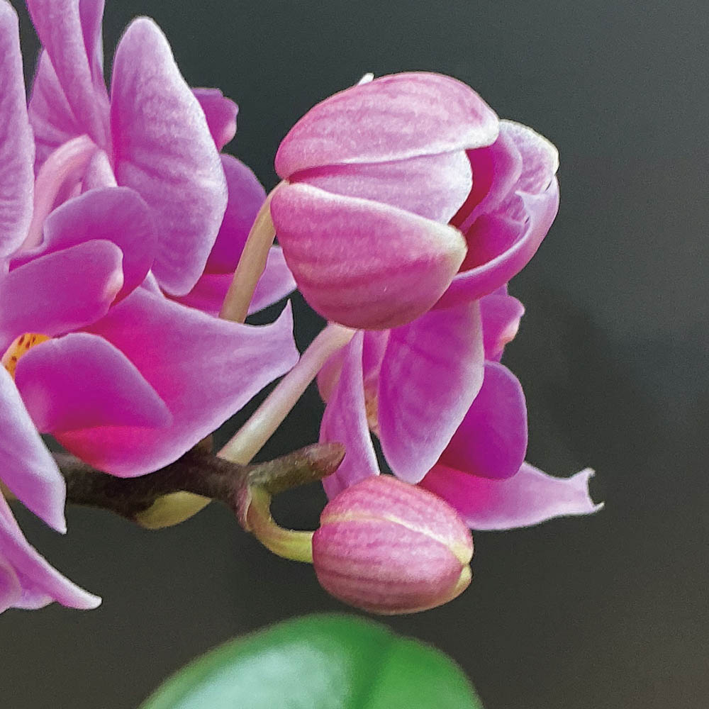 蛍光ピンクの花弁に濃い目のピンクの筋が入るかわいらしい花色が特長的な品種の胡蝶蘭です。