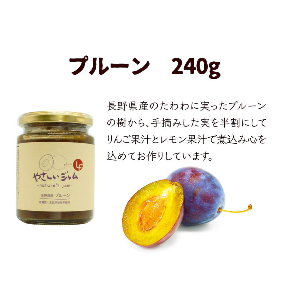 長野県産のプルーンを長時間煮込みリンゴ果汁で甘さをつけた、果実味あふれる「やさしいももジャム」3個セット。砂糖不使用・添加物不使用なので、赤ちゃんからご年配の方まで幅広く安心してお召し上がりいただけます。