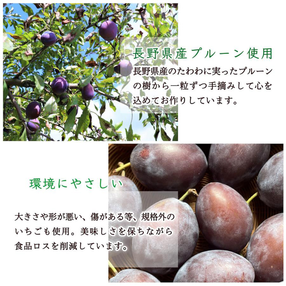 ■原材料名:プルーン:プルーン(長野県産)、濃縮りんご果汁、レモン果汁(一部にりんごを含む)