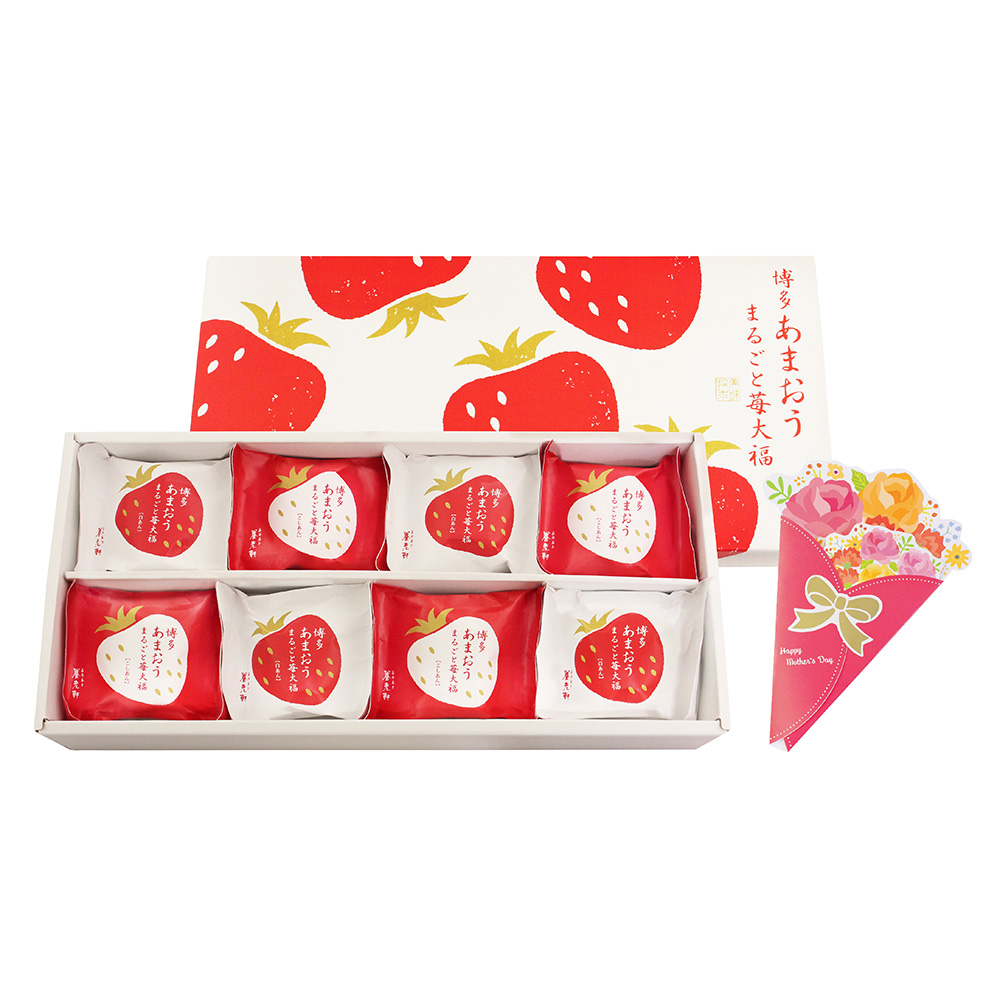 福岡の苺農家さんが愛情たっぷりに育てたMサイズの博多あまおうを、まるごと1玉使用した紅白2種類の苺大福。一口頬張ると、あまおうの酸味と、あんこの上品な甘みがお口の中に広がります。半解凍で美味しくお召し上がりいただけます。フルーツ大福で有名な京都養老軒監修。母の日のメッセージをつけてお届けいたします。