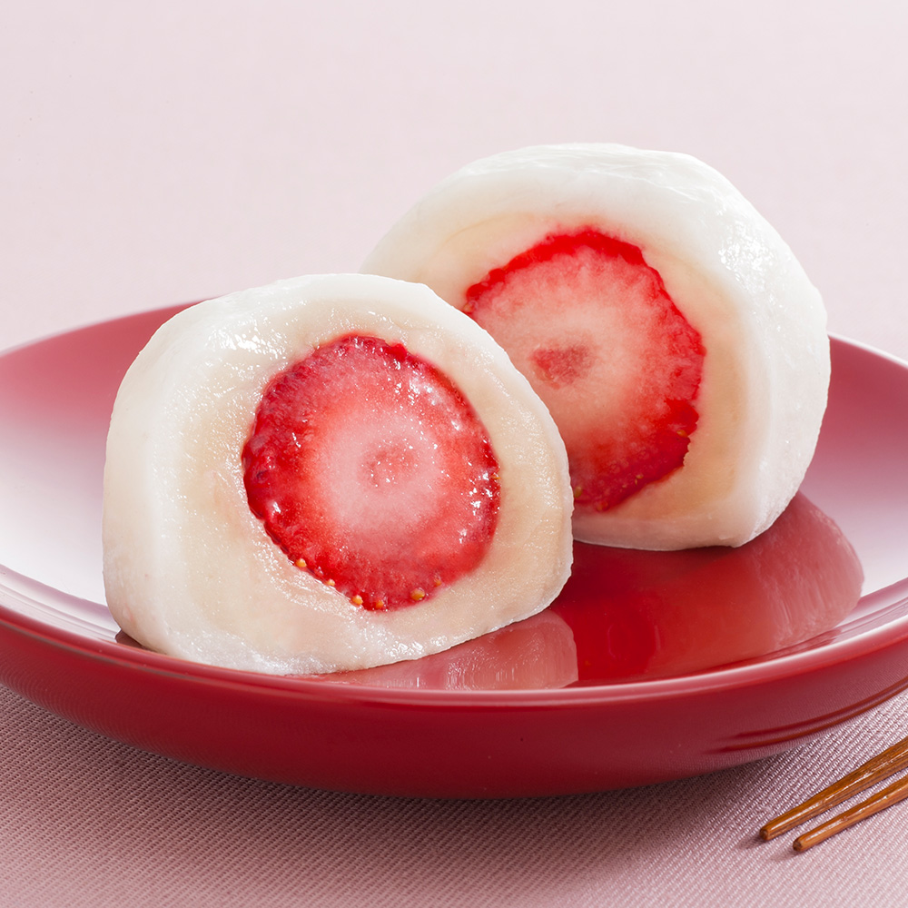 福岡の苺農家さんが愛情たっぷりに育てたMサイズの博多あまおうを、まるごと1玉使用した紅白2種類の苺大福。