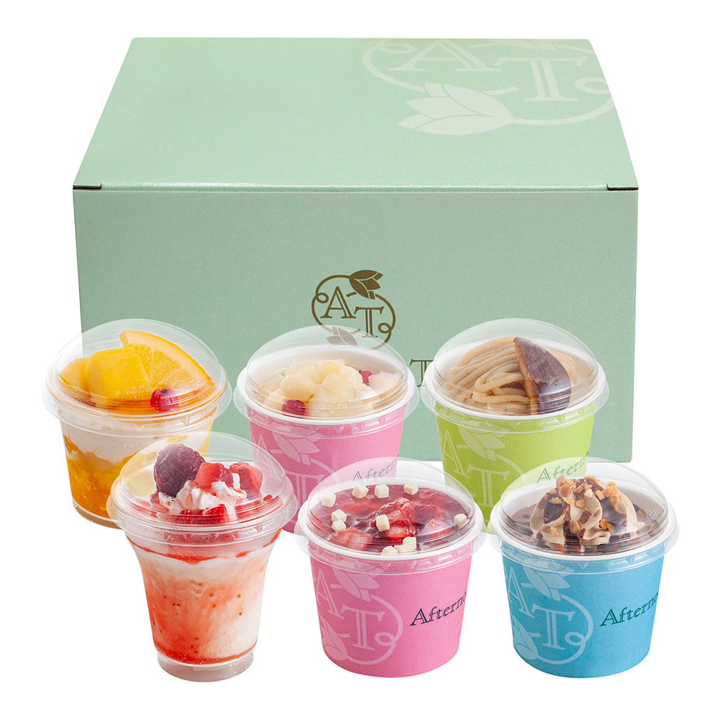 ■規格:苺のパフェ80ml・スイートフルーツティーパフェ82ml・渋皮栗のモンブラン94ml×各1、洋梨とアールグレイ・苺とチーズ・ダブルチョコレート各103ml×各1(計6)