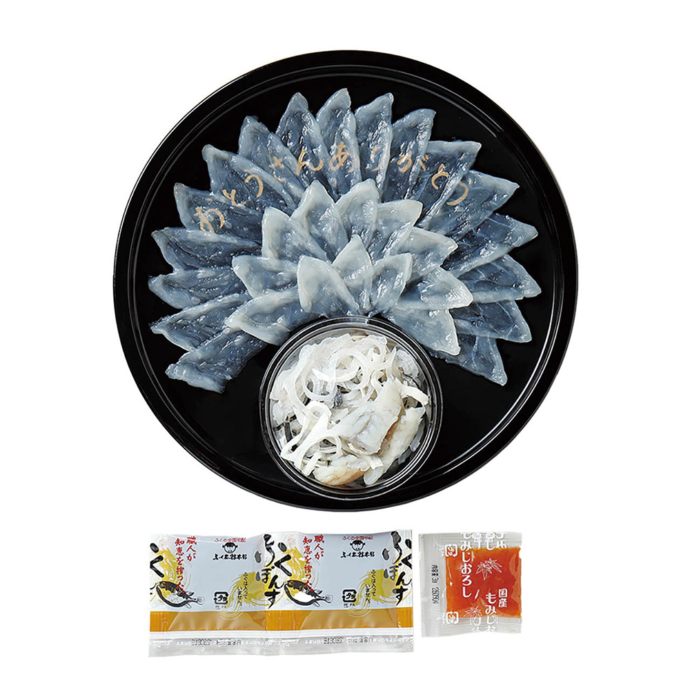 ■規格:とらふく刺身40g、とらふく皮40g、プラスチック皿21㎝(「おとうさんありがとう」文字入り)、ポン酢10g×2、モミジオロシ3g、「お父さんありがとう」のメッセージ入りしおり