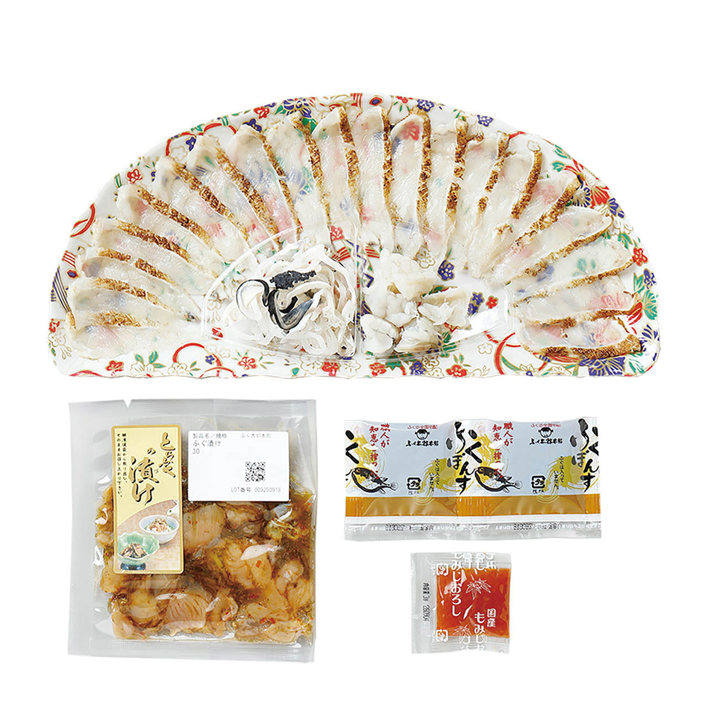 ■規格:まふく炙り刺身60g、とらふく皮30g(プラスチック皿)、とらふくの漬け30g、ポン酢10g×2、モミジオロシ3g、「お父さんありがとう」のメッセージ入りしおり