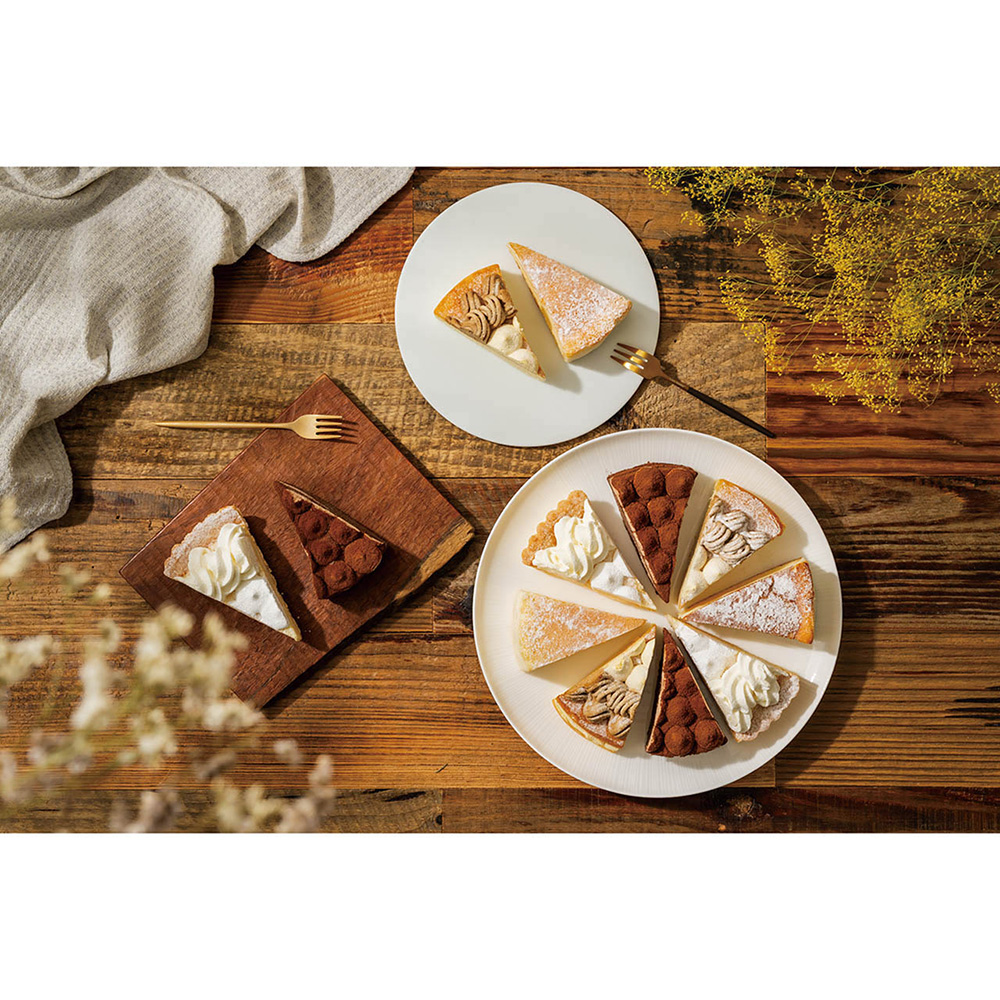 バラエティに富んだ4種のケーキが食べられる満足セット?ほんのりとした甘さとしっとり口どけが魅力のチーズスフレ。ココアスポンジでガナッシュホイップをサンドしたココアチョコ。マロンクリームをサンドし、天面に渋皮マロンを合わせた栗の風味が口いっぱいに広がるモンブラン。ほろっと食感のタルトに、ほのかな酸味の爽やかなチーズホイップを合わせたレアチーズ。