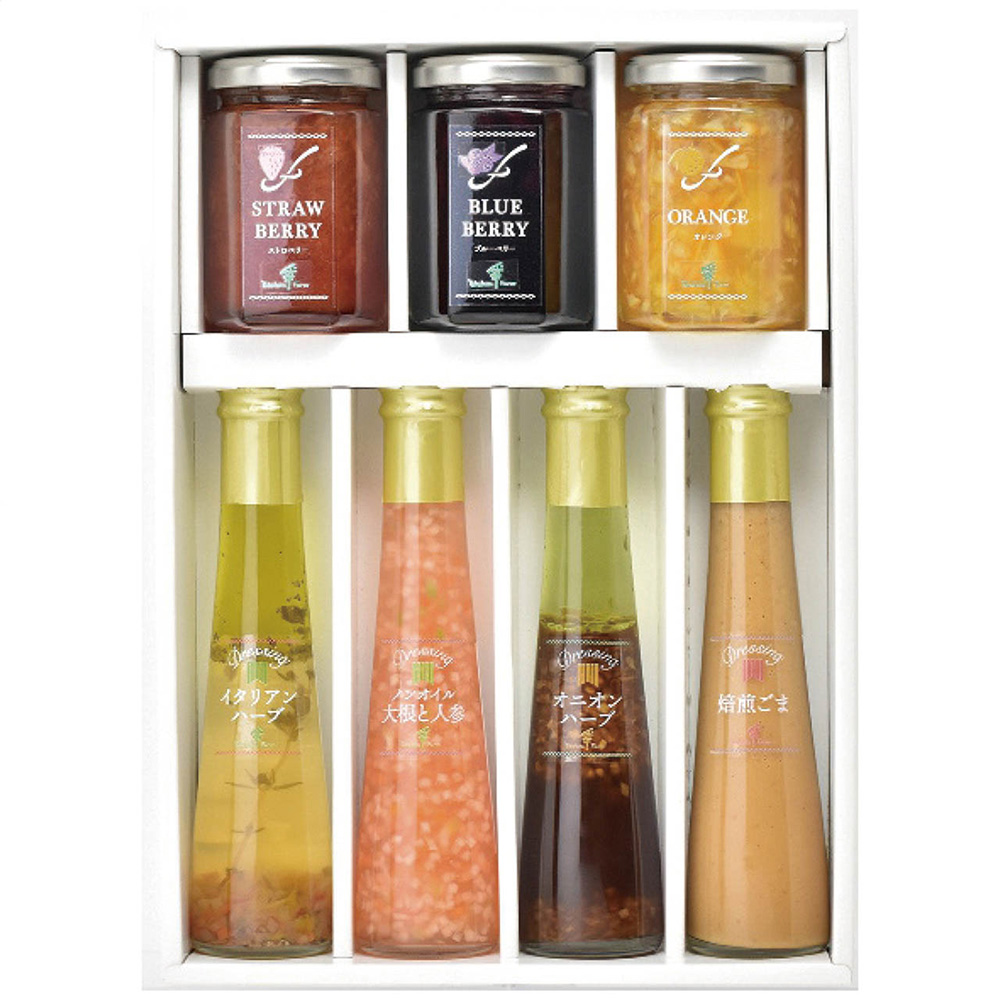 ■規格:ジャム145g(ストロベリー、ブルーベリー、オレンジ各1個)、ドレッシング122ml(イタリアンハーブ、ノンオイル大根と人参、オニオンハーブ、焙煎ごま各1本)
