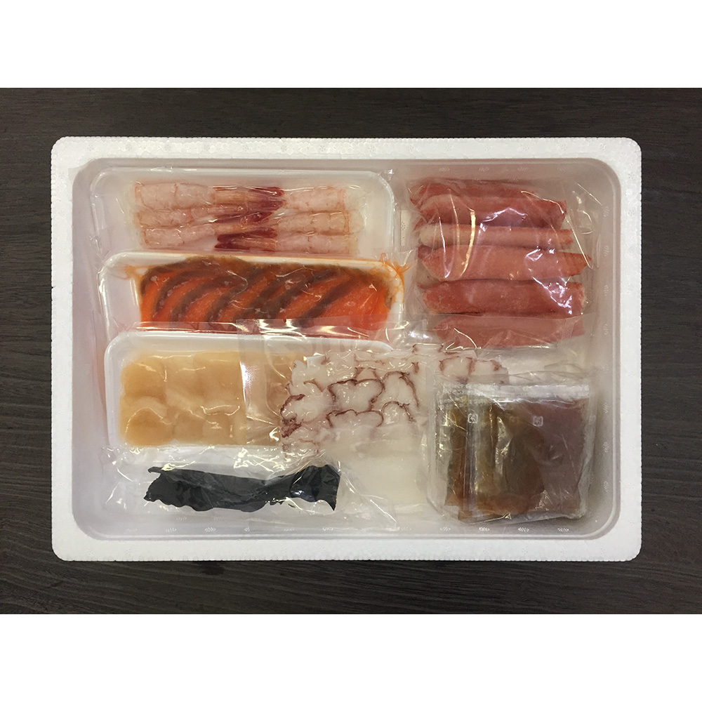 ■規格:生ずわいがに棒ポーション200g×1、たこスライス100g×1、生甘海老(尾付むき海老)10×1、生帆立貝柱スライス100g×1、トラウトサーモンスライス100g×1、だし用昆布5g×1、たれ(しゃぶしゃぶ用)15g×6