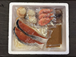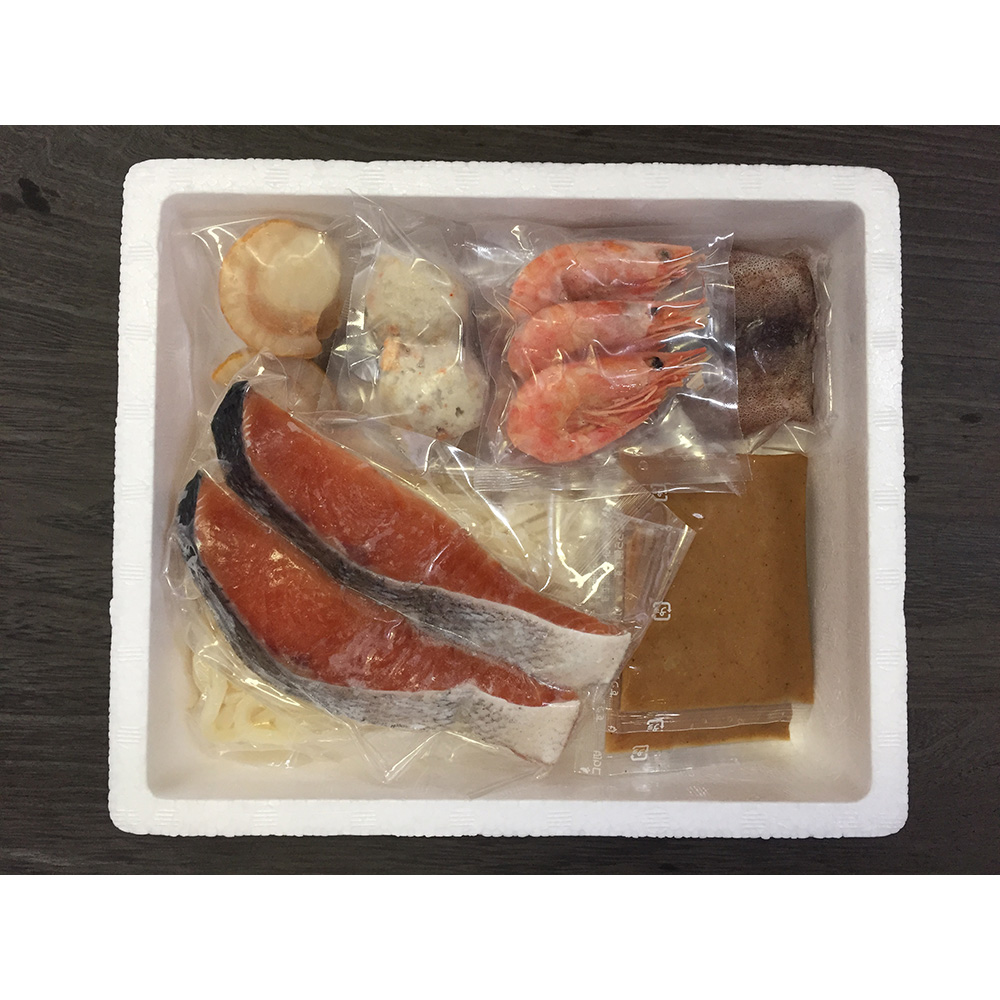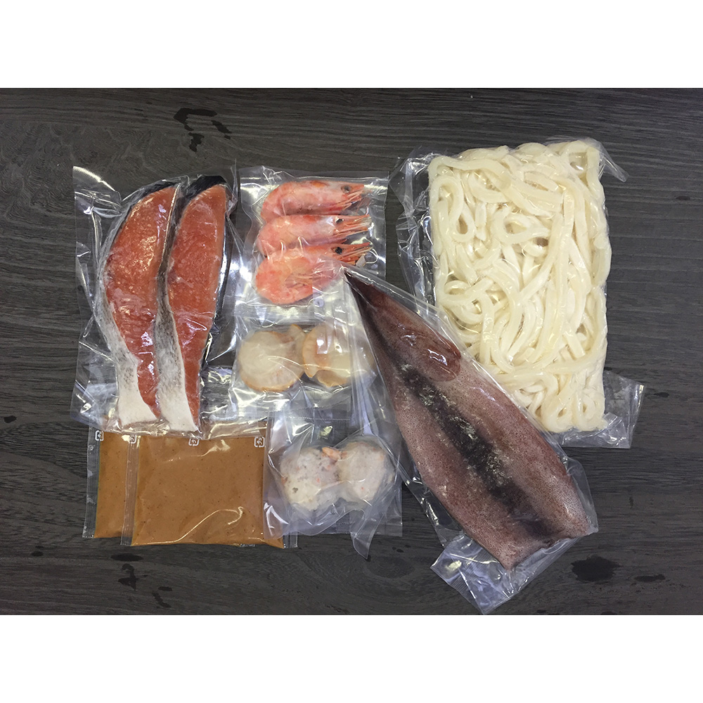 ■規格:秋鮭切身40g×2切、ボイル海老×3尾、ボイル帆立×2個、えび入つみれ×2個、ツボ抜きいか100g×1尾、冷凍うどん250g×1玉、たれ(濃縮:味噌仕立て)50g×2袋