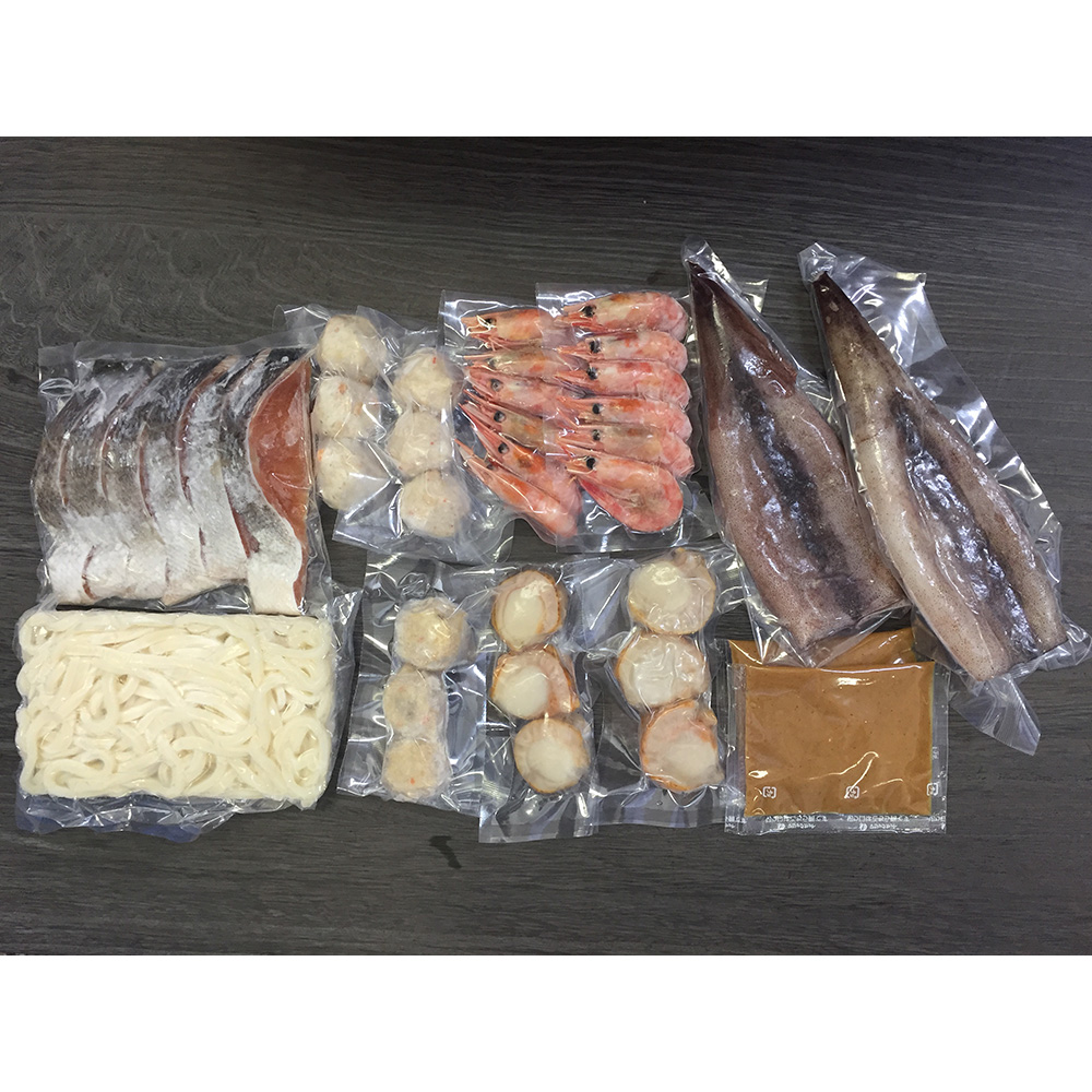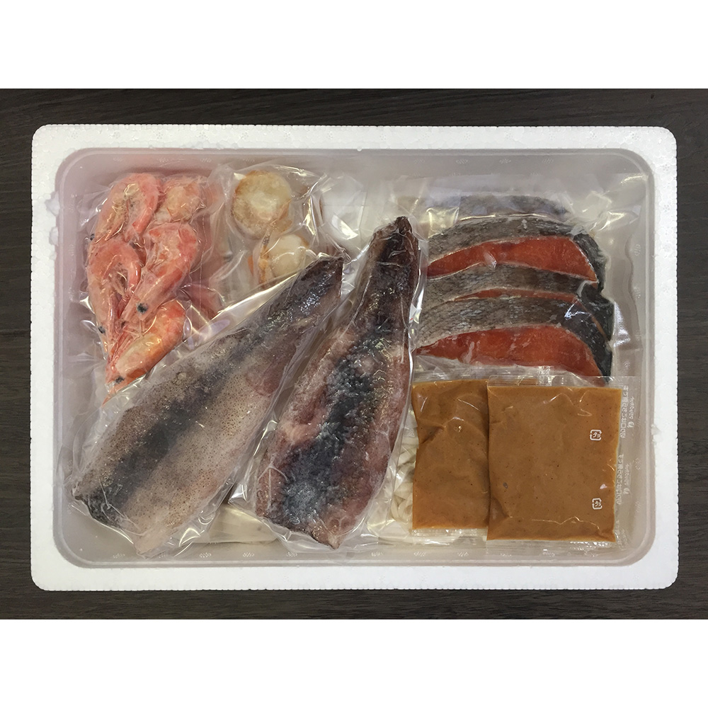 ■規格:秋鮭切身40g×6切、ボイル海老×12尾、ボイル帆立×6個、かに入つみれ×3個、えび入つみれ×3個、とりごぼうつみれ×3個、ツボ抜きいか100g×2尾、冷凍うどん250g×1玉、たれ(濃縮:味噌仕立て)50g×2袋
