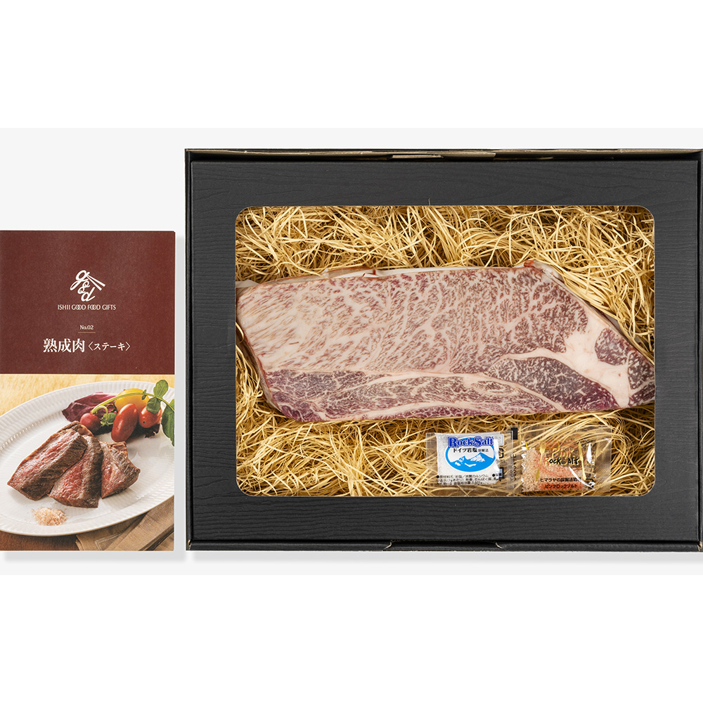 発酵熟成肉とは産学連携で明治大学とミートエポックが開発した「エイジングシート」を使用した製法で熟成させたお肉です。専用の熟成庫にて仕込まれた発酵熟成肉は、余分な水分(自由水=ドリップ)は飛ばしつつ、旨味を湛えた結着水はお肉に閉じ込めることで4つの特徴、「テンダネス(やわらかさ)」、「フレーバー(特有の芳醇な風味)」、「テイスティ(旨味)」、「ジューシー(本来の水分)」が生み出されます。従来の乾燥熟成(ドライエイジング)よりジューシーに深化しています。使用部位は赤身と脂のバランスの良い肩ロース肉。凝縮された黒毛和牛本来の旨みを1ポンドステーキで豪快にお召し上がりください。岩塩2種と焼き方レシピ付き