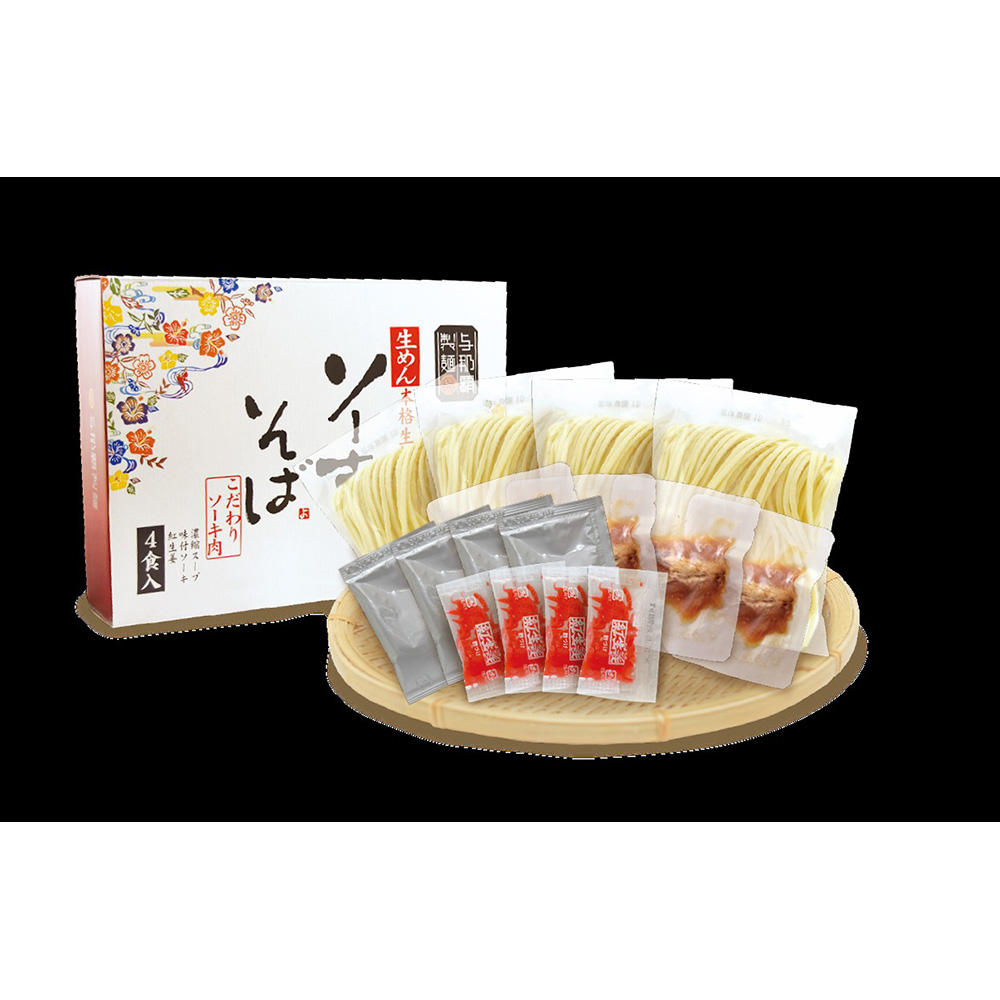 もちもち食感生麺、柔らか軟骨ソーキ肉、かつおの効いたそばだしに紅生姜が付いたギフトセットとなっおります。