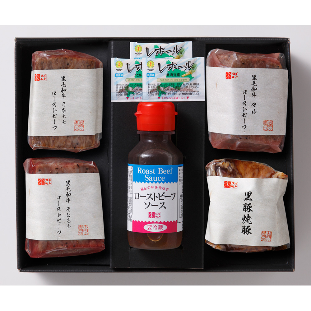 ■規格:黒毛和牛うちももローストビーフ・黒毛和牛マルローストビーフ・黒毛和牛そとももローストビーフ・黒豚焼豚各100g、ローストビーフソース100ml、レホール3g×3