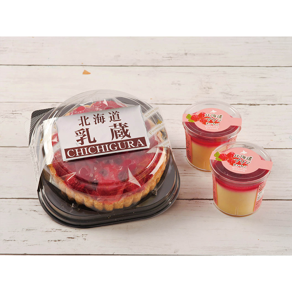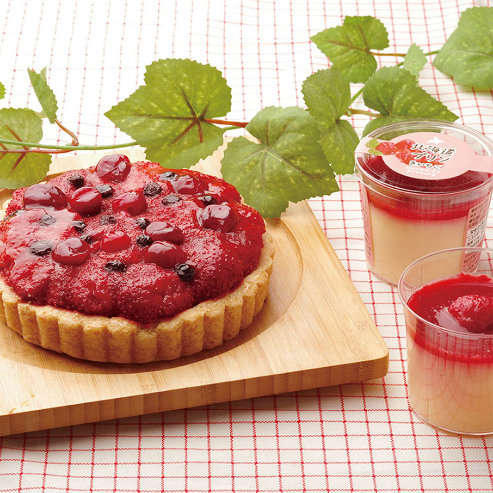 北海道産クリームチーズを使用しストロベリーなどの甘酸っぱいベリーを乗せたタルトケーキと北海道産の牛乳を使用したプリンに「木苺ソース」をかけたプリン。