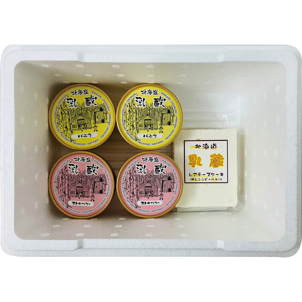 ■規格:乳蔵アイス(バニラ・ストロベリー・)各80ml×2個、レアチーズケーキ(オレンジピール入り)100g×1