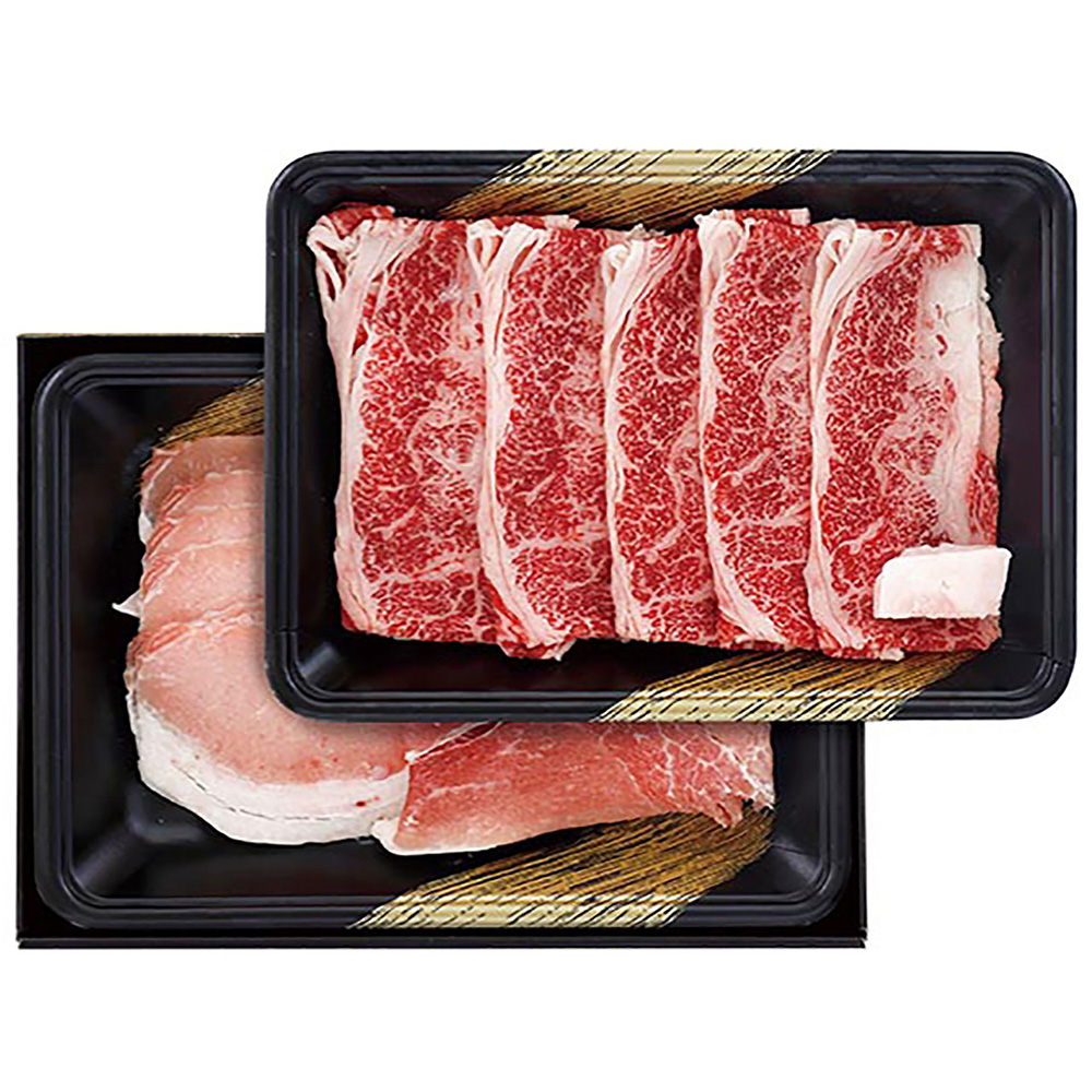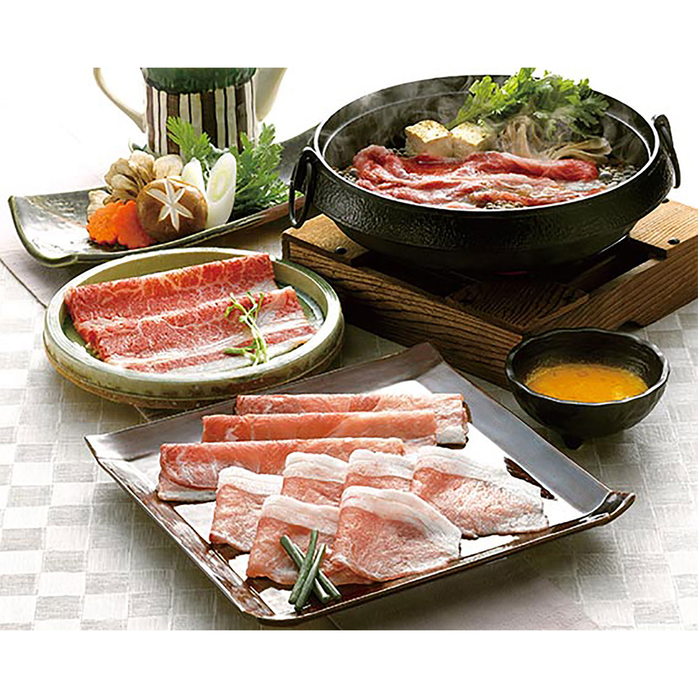 国産の黒毛和牛と九州産の黒豚を一度に楽しめるすきやき肉の食べくらべセットです。旨味の違いをお楽しみください。
