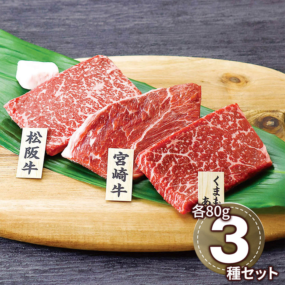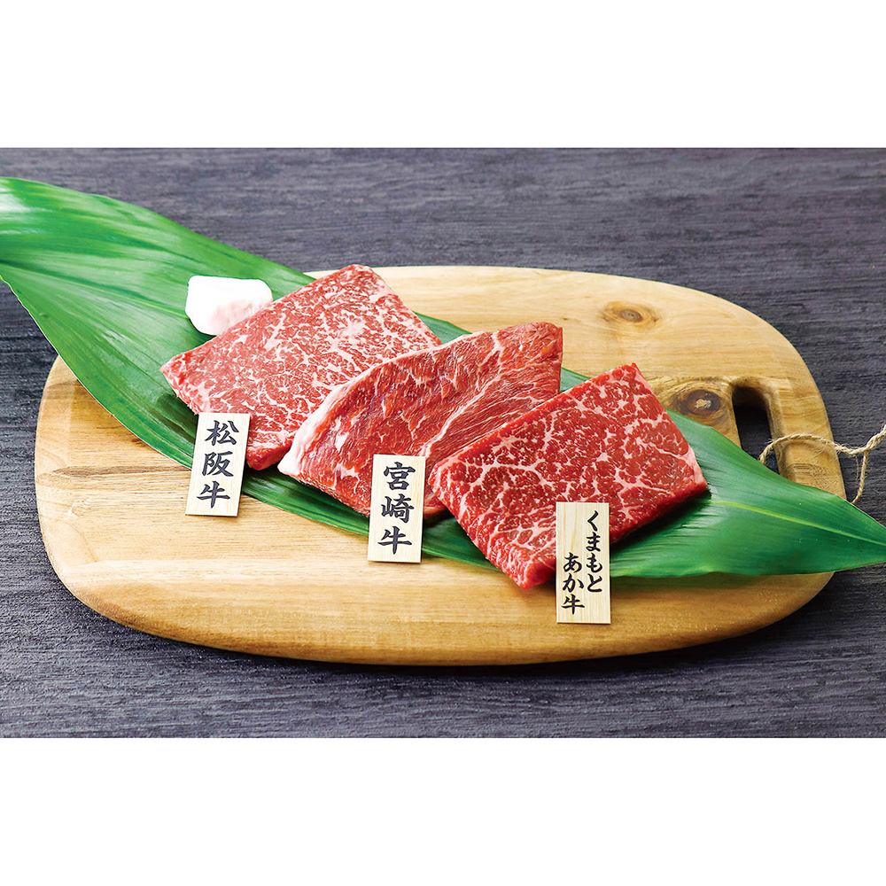 松阪牛(三重県)・宮崎牛(宮崎県)・くまもとあか牛(熊本県)のもも肉をステーキ用にカットしてお届けします。「銘柄牛」3種それぞれの肉質、赤身肉の美味しさをお楽しみください。