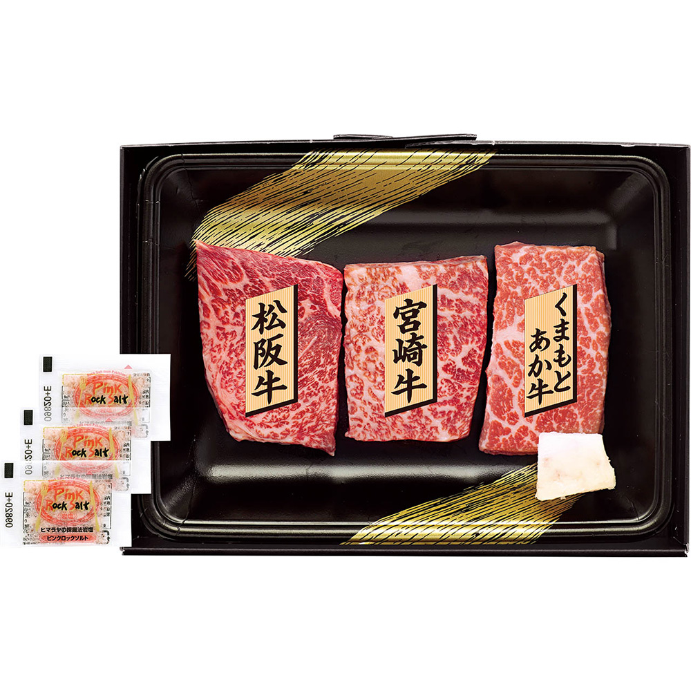 ■規格:松阪牛もも肉・宮崎牛もも肉・くまもとあか牛もも肉 各80g(ヒマラヤ岩塩付)