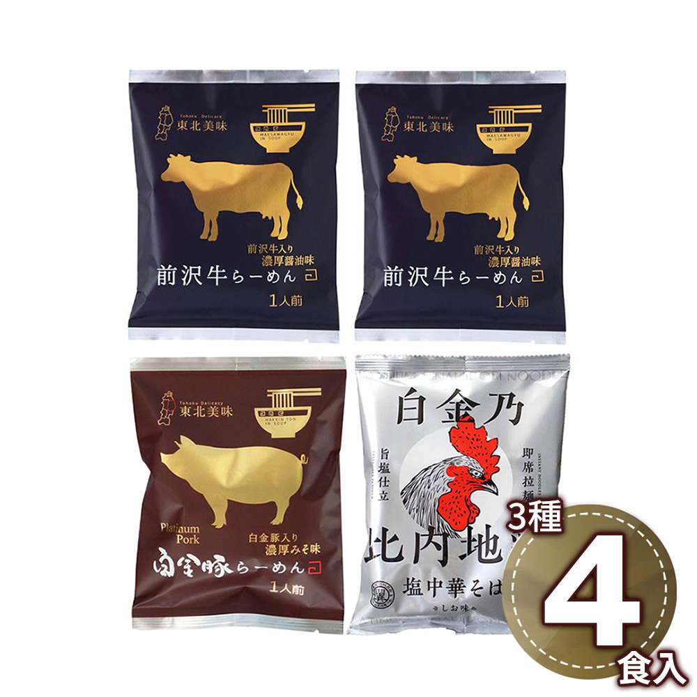 ■規格:前沢牛らーめん(濃厚醤油味)120g×2、白金豚らーめん(濃厚味噌味)135g・白金乃比内地鶏(塩中華そば)119g×各1