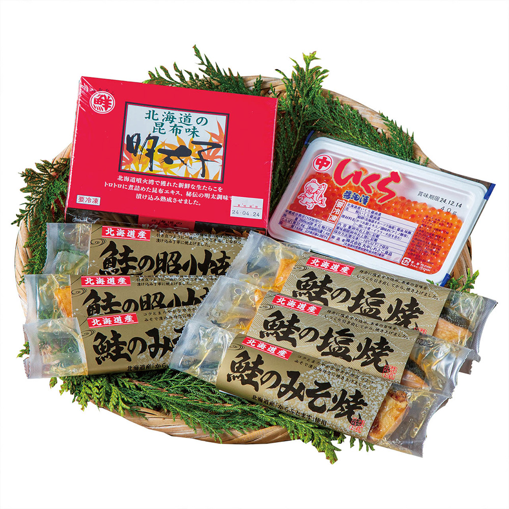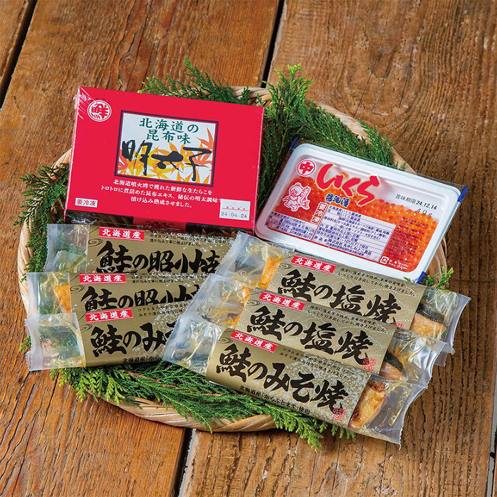 ■規格:北海道産 昆布味明太子120g、北海道産 いくら醤油漬け40g、北海道産鮭切身×6切(塩焼き・みそ焼・照焼き 各2切)