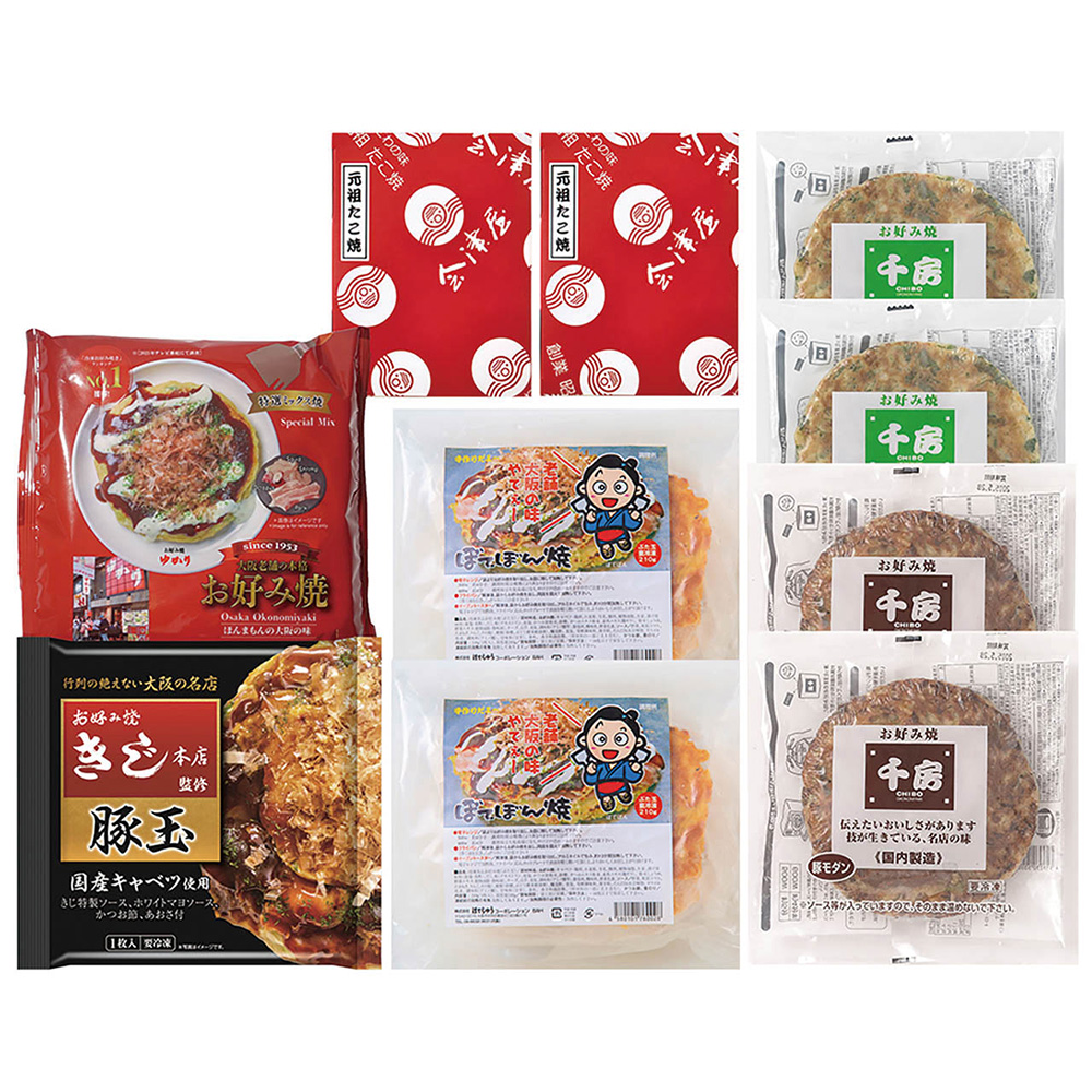 ■規格:千房ねぎ焼き180g・千房豚モダン焼き220g・ぼてぢゅう豚玉240g・元祖たこ焼き(12個入)150g×各2、ゆかり特選ミックス焼き220g・きじ豚玉256g×各1