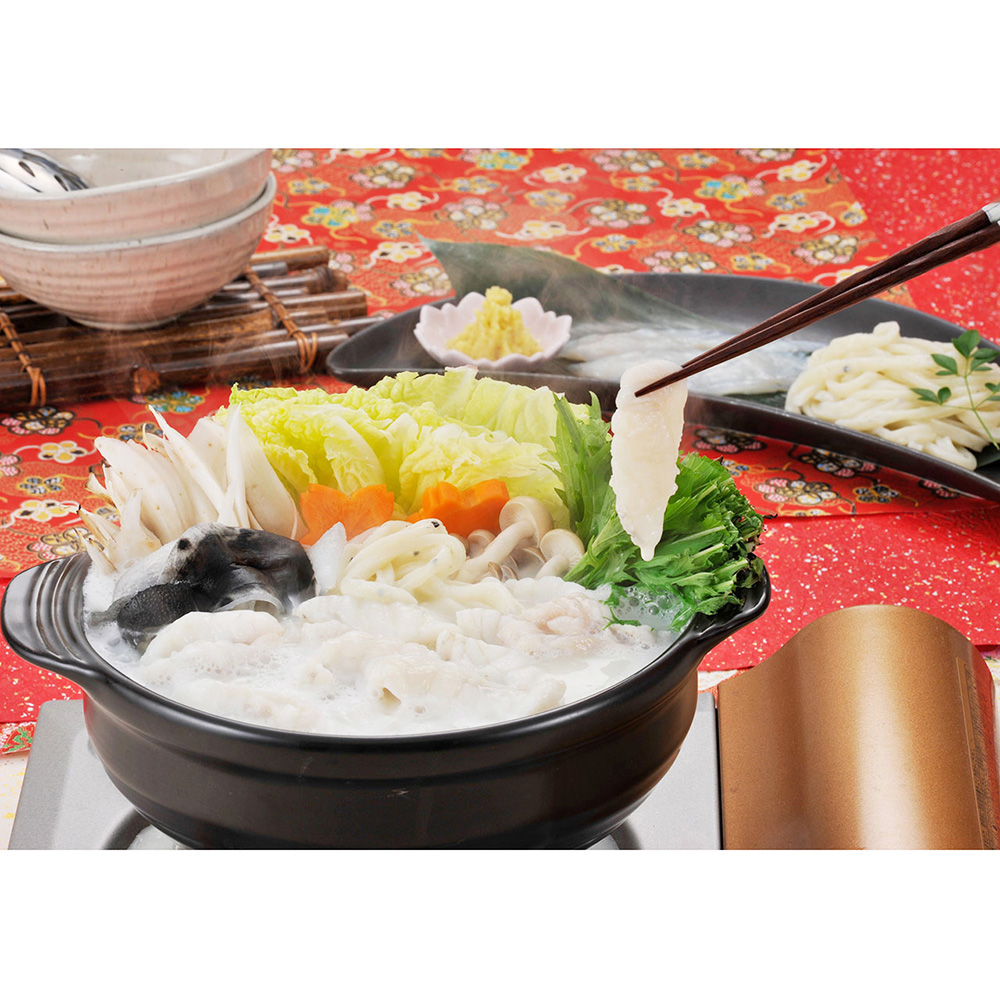 ■規格:まふくスライス150g、とらふくコラーゲンしゃぶ用皮40g、とらふく入りうどん250g、生姜(塩入り)16g、だし用昆布1枚、豆乳鍋の素180ml、ポン酢35g