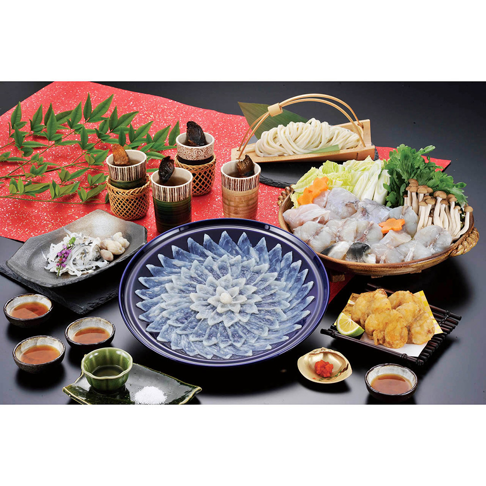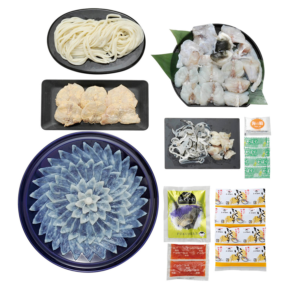 ■規格:とらふく刺身115g(陶器皿30cm)、とらふく皮40g×2、ふくちり400g(アラ:トラフグ・身:マフグ各200g)、ごまふくから揚げ粉付き200g、とらふく入りうどん250g、ひれ酒用ヒレ5枚、ポン酢35g×4、モミジオロシ16g×2、塩5g、カボス果汁2ml×4