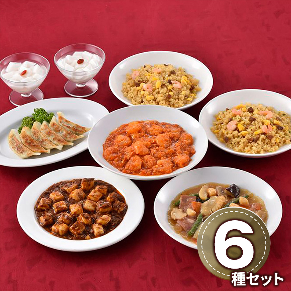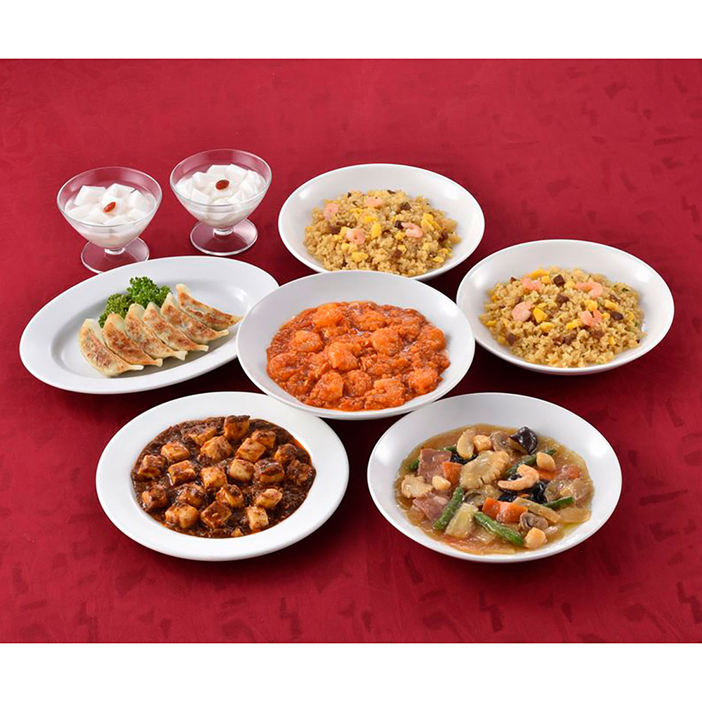■規格:餃子120g(6個入)×1、本格四川麻婆豆腐150g×1、乾焼蝦仁(エビチリソース)150g×1、本格八宝菜150g×1、ふっくら五目炒飯(200g×2)×1、杏仁豆腐500g×1※パッケージデザインが変更になる場合がございます。