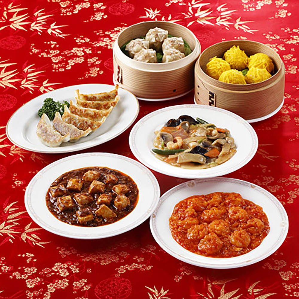 ■規格:餃子120g(6個入)×1、貝柱入焼売150g(5個入)×1、錦糸焼売125g(5個入)×1、乾焼蝦仁(エビチリソース)150g×1、本格四川麻婆豆腐150g×1、本格八宝菜150g×1※パッケージデザインが変更になる場合がございます。